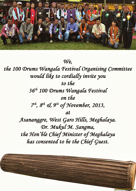 The 39th Hundred Drums Wangala Festival of the Garos will be celebrated at Asananggre, 18 kms from Tura, the district headquarter of West Garo Hills on the10th, 11th and 12th of November 2016.